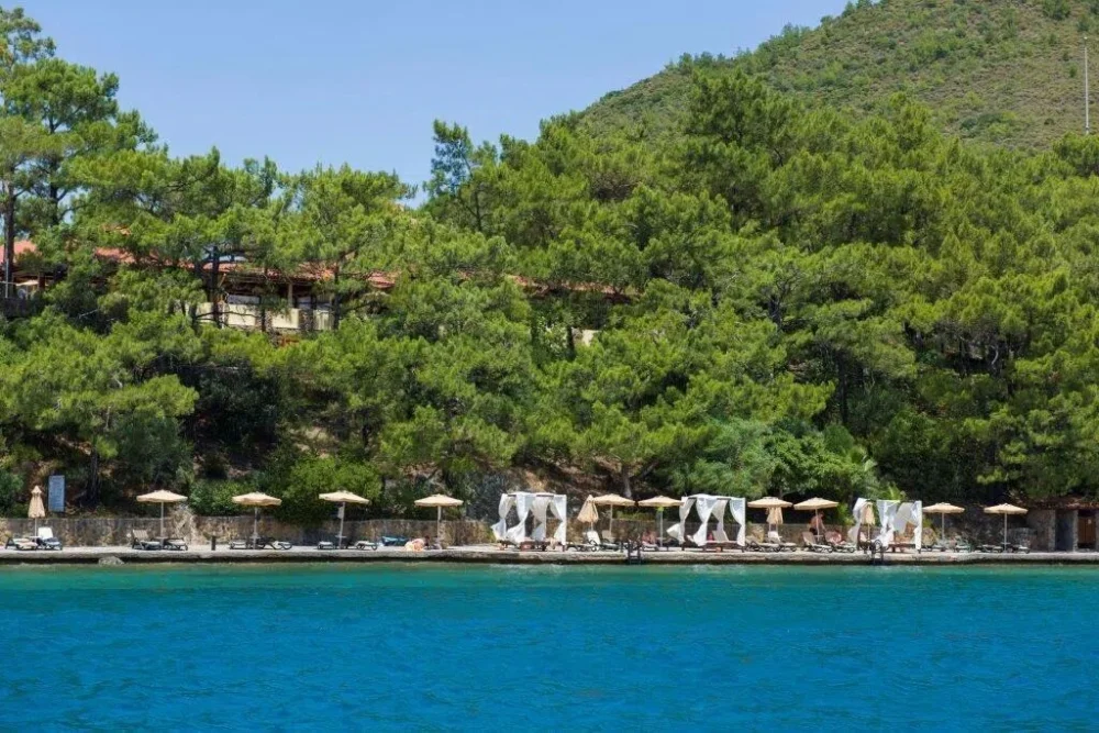Marmaris Bay Resort, de ultieme vakantiebestemming waar het blauw van de zee en het verfrissende groen van de tuinen samenkomen. Met twee verleidelijke zwembaden en een privéstrand aan je voeten, is elke dag een uitnodiging om te relaxen en te genieten van de zon. Perfect voor liefhebbers van water en ontspanning!